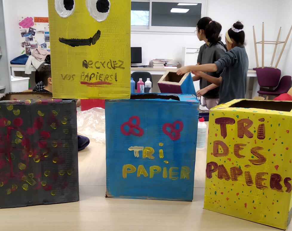 Au programme de l’année : création de cartes à graines de papier recyclé et décoration du papier avec des teintures végétales, fabrication de sacs en tissu à partir de vieux t-shirts et impressions avec des empreintes, création de sculptures en bouchons en volume et à plat, création de jardinières poétiques, fabrication de bijoux en papier selon la technique des paperolles, fabrication et customisation de poubelles pour le tri des déchets.