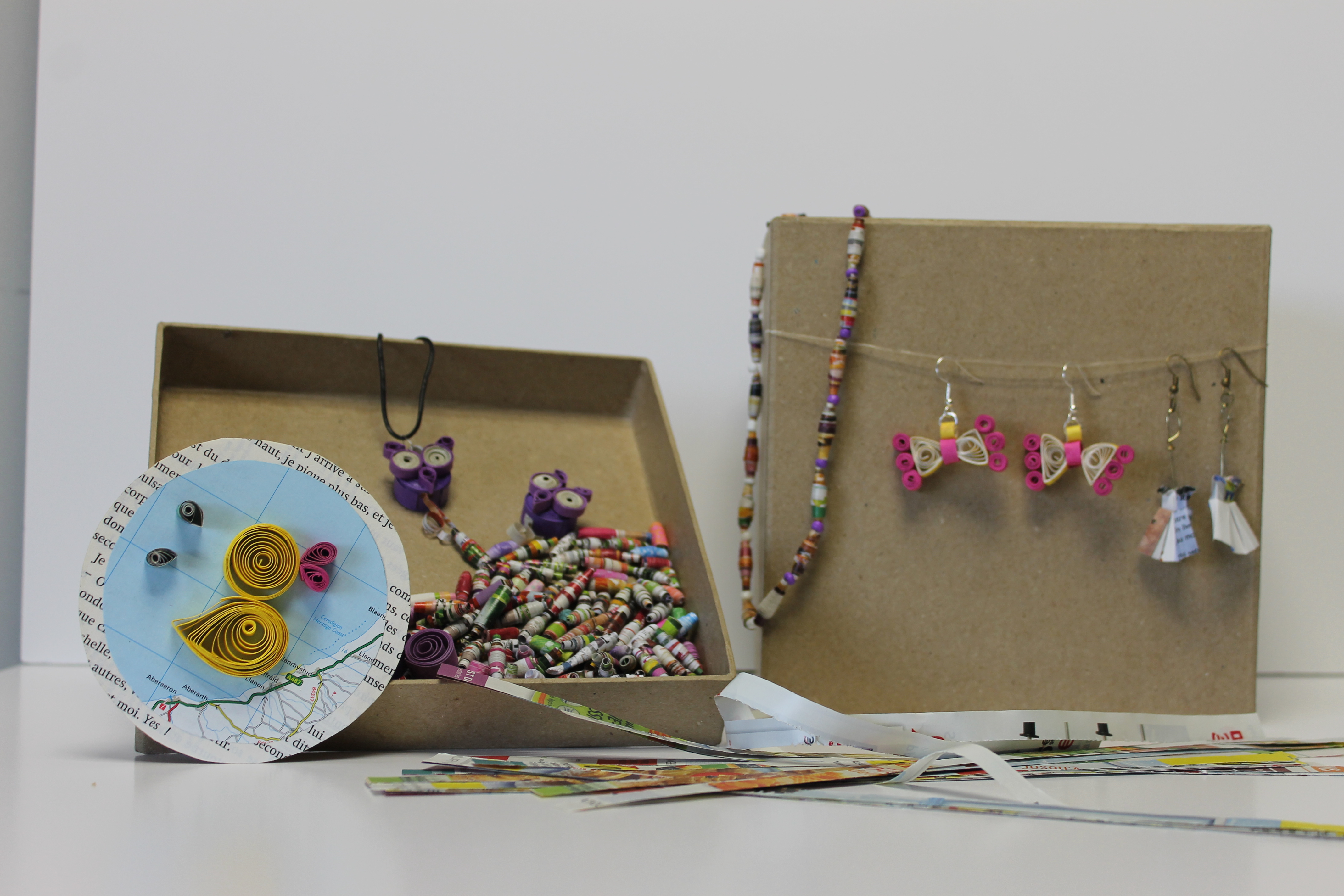 Au programme de l’année : création de cartes à graines de papier recyclé et décoration du papier avec des teintures végétales, fabrication de sacs en tissu à partir de vieux t-shirts et impressions avec des empreintes, création de sculptures en bouchons en volume et à plat, création de jardinières poétiques, fabrication de bijoux en papier selon la technique des paperolles, fabrication et customisation de poubelles pour le tri des déchets.