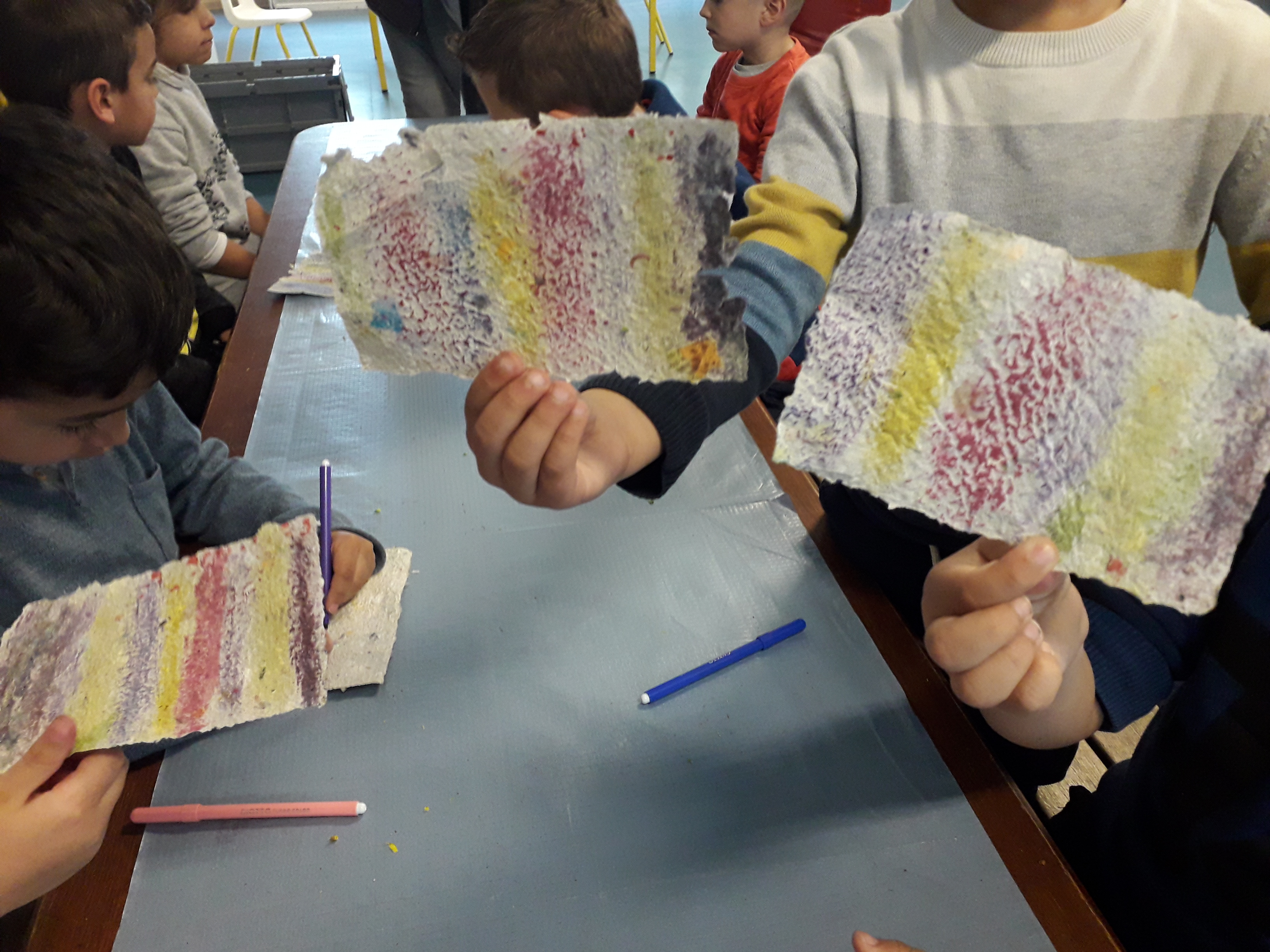 Au programme de l’année : création de cartes à graines de papier recyclé et décoration du papier avec des teintures végétales, fabrication de sacs en tissu à partir de vieux t-shirts et impressions avec des empreintes, création de sculptures en bouchons en volume et à plat, création de jardinières poétiques, fabrication de bijoux en papier selon la technique des paperolles, fabrication et customisation de poubelles pour le tri des déchets.
