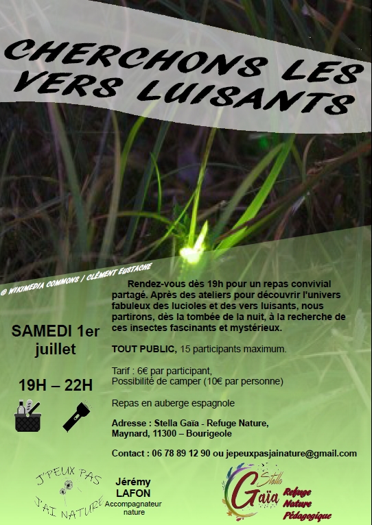 Rendez-vous dès 19h pour un repas convivial partagé. Après des ateliers pour découvrir l'univers fabuleux des lucioles et des vers luisants, nous partirons, dès la tombée de la nuit, à la recherche de ces insectes fascinants et mystérieux.
